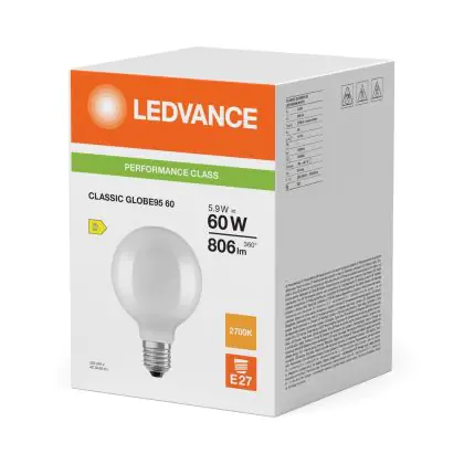 La Ledvance Classic LED Globe Ghiaccio 5.9W 806lm - 827 Bianco Molto Caldo | Sostitutiva 60W è la perfetta sostituzione per la tua lampada convenzionale 60W con attacco E27 grazie alla sua tecnologia LED. Passare a LED ti offrirà tanti vantaggi!