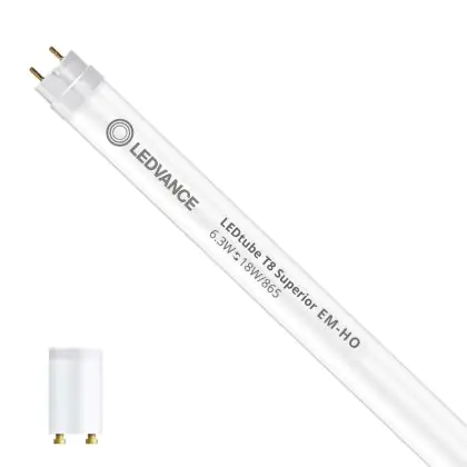 Il Ledvance Tubo LED T8 Superior (EM/Mains) High Output 6.3W 1100lm - 865 Luce Del Giorno | 60cm - Sostitutiva 18W è l’alternativa perfetta per il tubo fluorescente standard 18W nelle plafoniere con un reattore. Con questo tubo LED hai una garanzia di una vita media utile molto lunga e 5 anni Lampadadiretta.it di totale garanzia. .