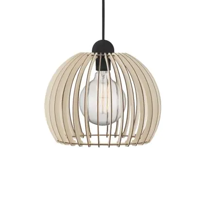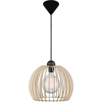 C'est une suspension au design morderne, avec un abat-jour composé de lattes de bois, qui permet une répartition agréable de la lumière. Lorsque l'ampoule est visible entre les lattes, il est recommandé de mettre une ampoule ayant un aspect décoratif. Le luminaire est parfait pour mettre au-dessus de votre cuisine ou de votre salle à manger. Attention, l'ampoule n'est pas incluse.