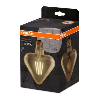 La Osram Vintage 1906 LED E27 Heart Filamento Oro 4.5W 470lm - 825 Bianco Molto Caldo | Sostitutiva 40W è la perfetta sostituzione per la tua lampada convenzionale 40W con attacco E27 grazie alla sua tecnologia LED. Passare a LED ti offrirà tanti vantaggi!